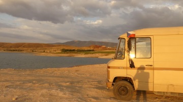 Jelikož do západu slunce zbývá ještě dostatek času, cheme přejet hory k řece v národním parku Nemrut Dagi Mili Parki. Bohužel hned za městem, jakmile se začne silnice klikatit do hor, začne Mercedes vařit. Aby toho nebylo málo, zjišťuji, že řetěz Doris to má již dávno za sebou. S přeskakujícím řetězm a vychladlým Merglem dojíždíme k jezeru u města Duztarla.