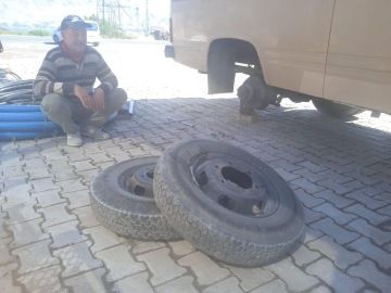 S Dzingisem vyrážíme 10km do města vyřešit situaci s dlouhým řetězem. Než odjedeme, natáhneme pod stromy s Petrem přísdtřešek, aby tu měli nějaký stín. U silnice si všimnu díly. Dojdeme se s Dzingisem zeptat, zda mi řetěz zkrátí. Oni ne, ale poskytnou nám svou dílnu. Bereme do ruky flexu, kladivo, hřebík a za 20min má řetěz správnou délku. Když už jsme tady, koupím 5kg PB láhev i s hořákem, abychom nemuseli shánět malé kartuše do našeho vařiče. Současně zjistíme, kde nám popřehazují kola na Merglu, neboť nemáme úplně ideální geometrii, takže vnitřní strany předních pneu jsou sjeté.