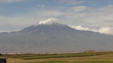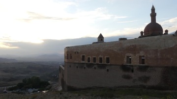 Při sjezdu dolu už se nám ukatuje Ararat v celé své kráse. Máme štěstí, na obloze jen pár mráčků a nám je radostí až do pláče. Dokázali jsme to, jsme tu! Teď už jen najít tu Noemovu archu! Pro dnešní noc si vybereme kemp nad městečkem (50/TL) Dogubayazit. Bohužel se Ararat večer schová do mraků. My si stihneme před spaním ještě vyšlápnout kopec k pevnosti a udělat trochu příjemný rozruch se Shadowem. Děti, které jsou v kempu z něj nemohou oči ani ruce pustit.