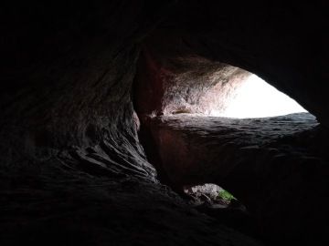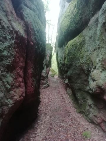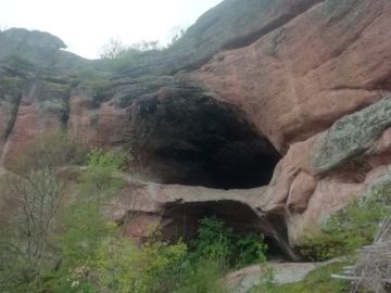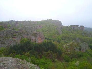 Rozhodneme se zkusit štěstí a navštívit ještě druhé skalní útvary o 2km dále. Lesní cestou jdeme podle červené a oranžové turistické značky. Skály zatím vidět nejsou. Vůbec netušíme kam nás to vede, ale cesta se neustále zhoršuje. Najednou se před námi objeví ukazatel na jeskyni Lepenitsa. Konečně má naše bloudějí směr. Koukneme do mapy, která říká 1,7km, 20min chůze. Po chvíli brodění blátem se ocitáme na vrcholku skal s úžasným výhledem. Sice mží, ale jsme pod mlhou, takže výhled máme famózní. Jen ty necelé 2km jsou poněkud delší, zdá se nám. Do toho všeho začne cesta přitvrzovat. Opatrně slézáme po vlhkých, kluzkých skalách, až se Petr s Hankou rozhodnou nepokračovat. S Ivou jim necháme hlídat Shadowa a pokračujeme dále. Musíme překonat strmí sráz uprostřed skal, ale výsledek je nám odměnou. Na konci trnité cesty se před námi skutečně otevírá slíbená jeskyně. Celou ji prolézáme.
