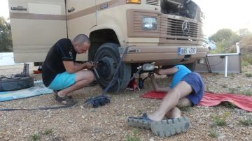 Čeká nás prohození kol, jelikož se nám přední pneumatiky kvůli špatné sbíhavosti každých 6tis km sjedou k jedné straně. Úkol by to byl vcelku lehký, kdyby se nám nerozbila panenka. Její oprava nám zabere 2 hodiny. Ve chvíli kdy už opravu chceme vzdát a sháním od ostatních turistů hever, podaří se Petrovi panenku zázračným způsobem (nejspíš odvzdušením) opravit. Což je záchrana, protože jediný kdo měl hever byl němec s transporterem, který má poloviční váhu. Za 15 minut už můžeme rozpalovat gril a grilovat místní skvělé klobásky i kousky kuřete.