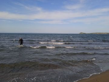 Před večeří se Petr rozhodl vyzkoušet neopren. Najednou to moře nebylo tak studené, takže v něm vydržel vcelku dlouho. My ostatní dali raději přednost morální podpory z břehu. Zítra se chystáme přesunout ještě o kousek na jih, třeba tam bude večer vidět ještě více hvězd než tady.