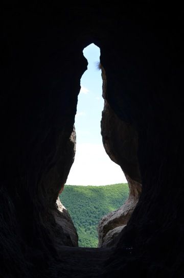 Konečně stojíme před jeskyní. "Hanka dovnitř asi nepůjde." pomyslím si, když vidím železný žebřík vedoucí do nitra jeskyně. Překvapila. Sice se musela asi neskutečně bát, ale zvládla to. Když tak koukám z jeskyně ven, přemýšlím co mi tvar těch stěn připomíná. No posuďte sami na fotkách.
