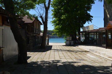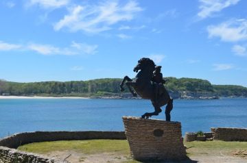 Okolo 14h vyrážíme do města. Jdeme po vyhřáté pláži. Hned po příchodu k městu nacházíme sochu koně s ženou. Nádhera. Jdeme hlouběji do města. Všechno je zavřené a některé restaurace se renovují. Procházíme celé letovisko, až na druhou stranu. Zde se nachází další pláž a kemp. Říkáme si, jak je dobře, že jsme ubytování v kempu Atliman. Tady totiž dost fouká a kemp vypadá, že není moc udržovaný. Hanka říká, ať pořídím co nejrychleji fotky, protože kvůli větru se zde nechce moc zdržovat. To nikdo z nás.
