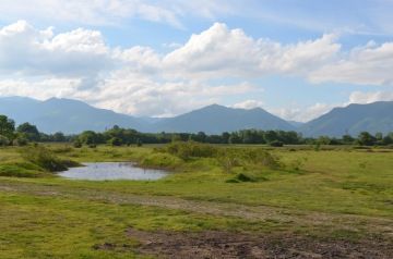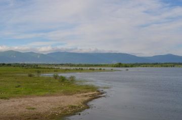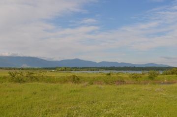 K vodě musíme jet polní cestou, ale netrefíme odbočku. Odbočujeme hned další možnou. Bohužel na prvním možném místě být nemůžeme, protože se tu pasou krávy a hlídají je psy. Volíme tedy cestu po vyjetych kolejích. Petr si dá trochu really. Podle map tu má být daleko méně vody. To nám ale vůbec nevadí. Našli jsme otevřené prostranství na břehu a krásný výhled na vodu. Paráda. Ale strašně tu fouká, tak jsme se šli poohlédnout po nějakém závětří. O pár metrů dále nacházíme strom s keři. Jedeme tam.