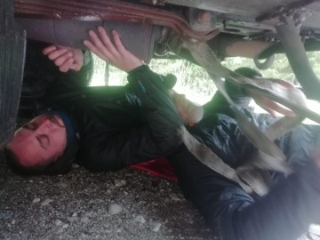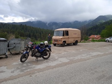Střídá se déšť, kroupy, sluníčko. Silnice je to nádherně zatáčkovitá podél řeky pod skalami. Začínáme stoupat k Chudnite Mostove. Po 10km posádka v Merglu zastavuje. Opět upadl výfuk! Čekáme než přestane pršet, abychom to s Petrem vyvázali. Přemýšlíme co dál. Najdeme ubytování v Čepelare, kde by snad mohli zítra mít i nějaký servis.