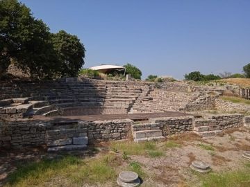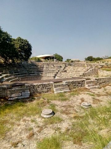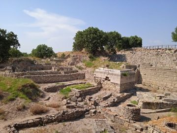 Trója jako taková jsou "obyčejné" ruiny, jejichž objevování nám zabere slabou hodinku. Výlet nám zpestří místní hafíci, kteří nechtějí Shadowovi dát pokoj, takže ho musíme vzít do náručí. V podvečer ochutnáme na ulici bagetu naplněnou směsí zeleniny a kousků masa. Je to vcelku mňamka za á 50,-Kč. Místo kempu zvolíme volné kempování na pláži s nádherným výhledem na zapadající slunce.