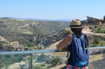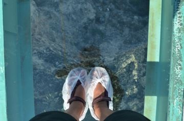 Mají zde udělanou parádní terasu s výhledem nejen do dálky, ale také pod sebe. Vcelku koukáme, když se Hanka překoná a jde po skleněné podlaze až na okraj. Do útrob kaňonu se však nevidáme, je vedro a šlapat vněm zpět nahoru se nám nechce. Snad někdy příště. Místo toho koukneme do mapy a najdeme si místo naspaní v horách Murat.