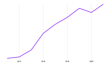 Graf 1: Zájem o FinTech (počet vyhledání termínu FinTech přes Google během let 2013–2021)