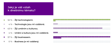 Během meetupu jsme se ptali hostů, jak vnímají propojení byznysu, technologií a kultury, protože právě toto spojení je jádrem našeho setkání. Chtěli jsme zjistit, kdo se cítí blíže kreativnímu světu umění a kdo je spíše orientován na byznys a technologie.